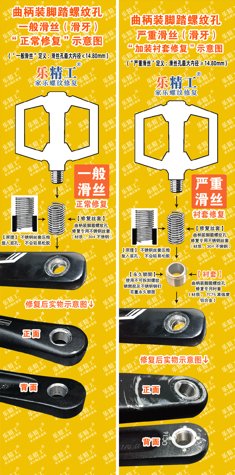 如滑丝孔“严重滑丝”,那么修复方法就是通过加装衬套的方式进行修复,衬套和曲柄间通过不可拆卸螺纹胶和数颗销钉双重永久锁固,然后在衬套内加装不锈钢丝套,修复后的强度也是远大于原始螺纹强度的,您也可放心摇车。